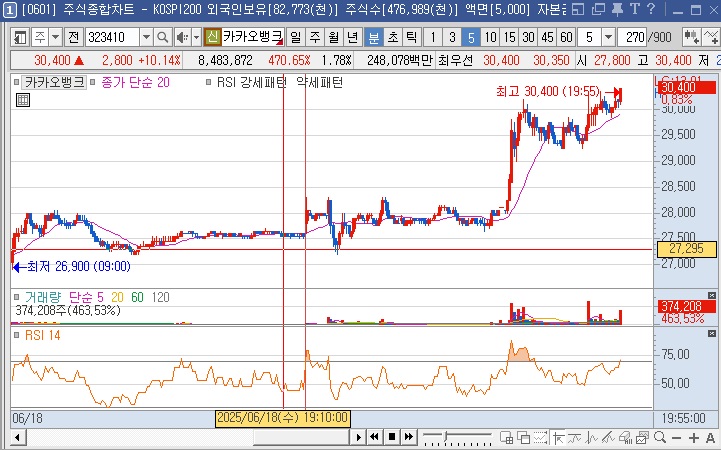스테이블코인 관련으로 급등 지속. 카카오도 9%대 상승.