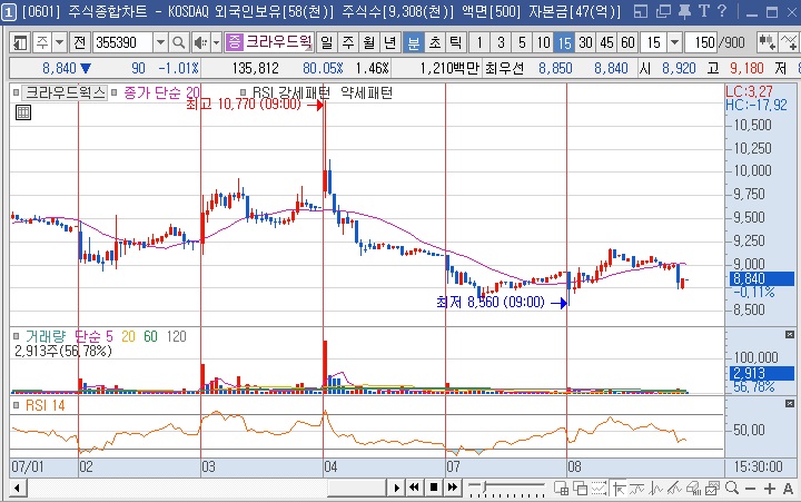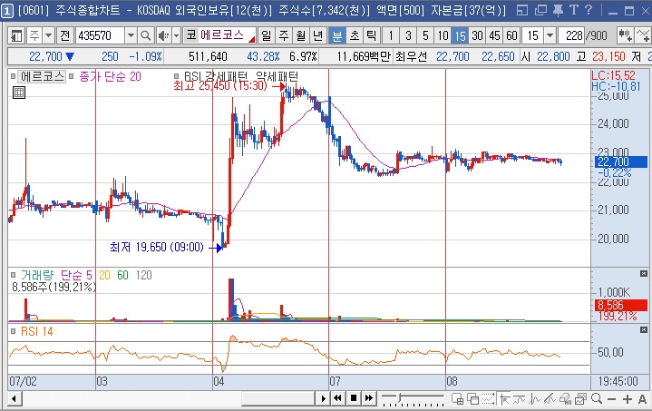 7/4일 1000억 이상 거래량 터진 후 2거래일 음봉. 5일선 닿음.