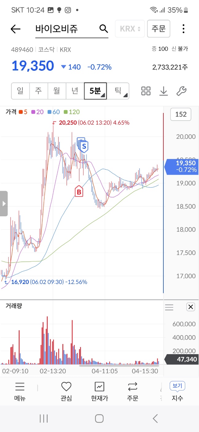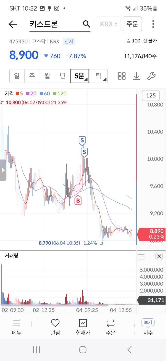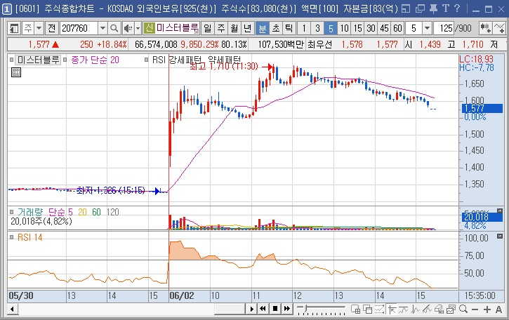 장시작후 하락 횡보하다가 9시15분부터 급등. 분할 매도.
